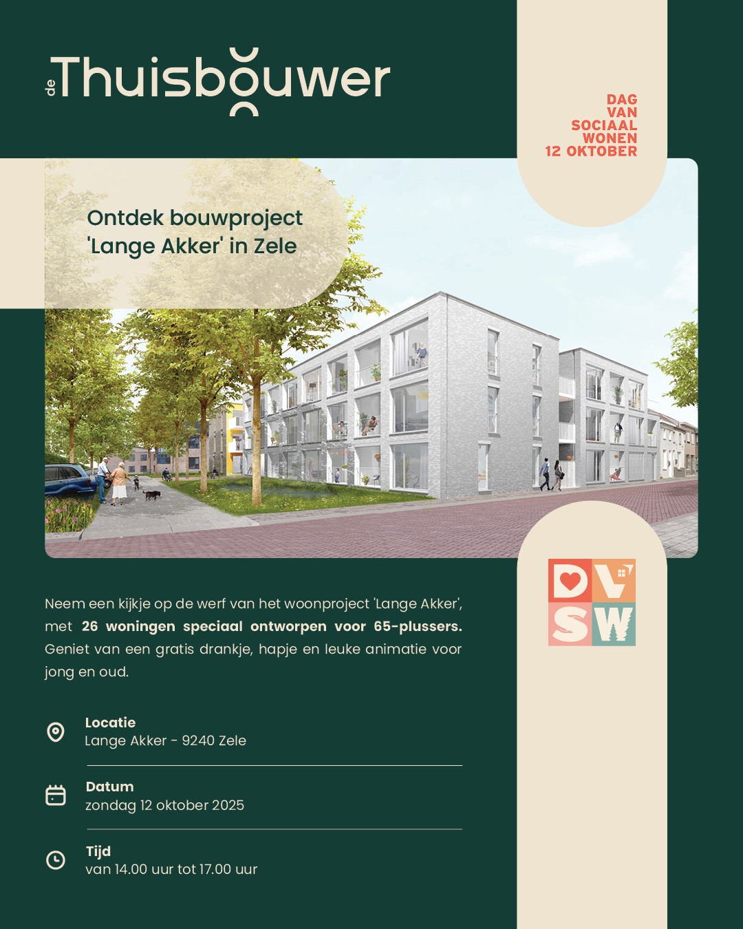 Neem een kijkje op de werf van het woonproject 'Lange Akker' in Zele. 26 woningen speciaal ontworpen voor 65-plussers. Geniet van een gratis drankje, hapje en leuke animatie voor jong en oud.